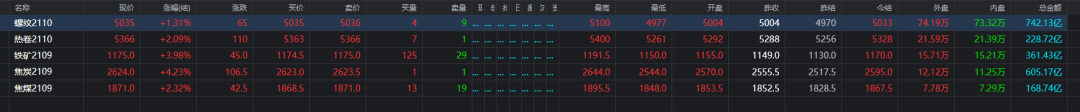 今日在鐵礦石的帶動下,期鋼翻紅,但震蕩幅度較大。期螺上漲65收報5035,期卷上漲110收報5366,鐵礦石上漲45收報1175,焦煤上漲42.5收報1871,焦炭上漲106.5收報2624。