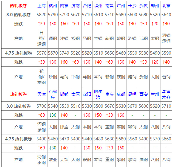 6月10日鋼鐵價格漲跌圖:主流上漲,個別下跌 6月10日建材價格:主流上漲; 今建材整體上漲,市場報價較昨日收盤整體拉漲20-100元/噸,價格上漲,下游整體采購尚可。心態方面,貿易商表示端午節前預計需求將會小幅釋放,因此節前價格趨強運行; 2 6月10日熱軋板卷價格:上行為主; 今全國熱卷穩中偏強運行,幅度20-60,期卷持紅上行,提振現貨市場,商戶挺價意愿趨強,多以出貨為主,然成交跟進不足,市場觀望情緒明顯,預計短期穩中調整;