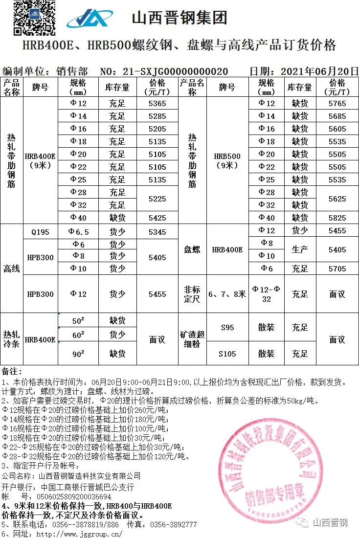 鋼廠快訊:6月20日,山東閩源對部分產品出廠價格進行調整,以“6月19日山東閩源建筑鋼材價格穩定”為基準,具體調整情況如下: