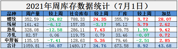 本周受“七一”慶典環保限產影響,五大品種產量下降較多,高達51萬噸。但庫存延續累增,總庫存較上周再增43.68萬噸,主要來自螺紋鋼累庫28.07萬噸。而從表觀需求來看,螺紋鋼需求下滑明顯,本周減少21萬噸,總需求下滑38萬噸。供需雙雙轉弱,令庫存進一步回升,且這一趨勢仍將延續,打壓鋼價,上行乏力。