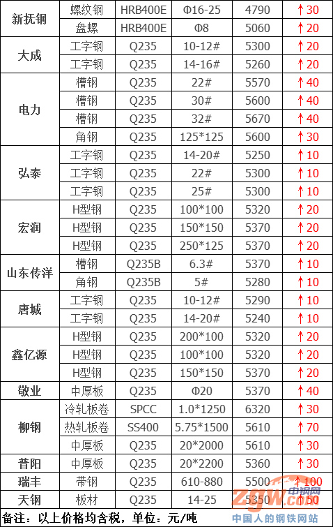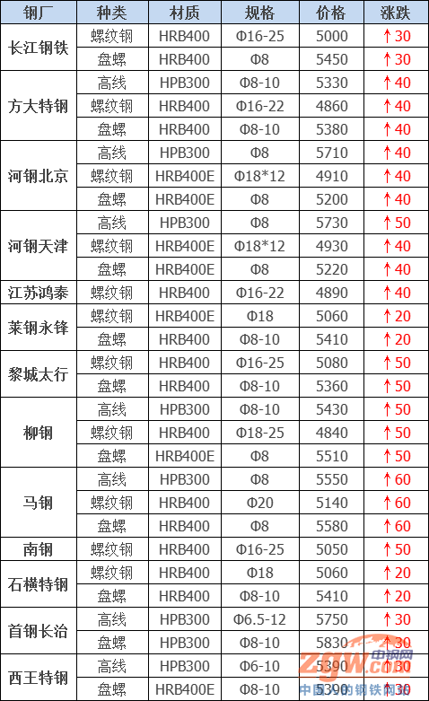 據中鋼網(公眾號:中鋼網)不完全統計,今日共30家鋼廠調價,漲幅最高為瑞豐帶鋼,調價幅度100元/噸,具體調價明細如下: 山西美錦建材價格平穩 山西建邦建材價格平穩 河鋼北京建材上調40元/噸 黎城太行建材上調50元/噸 首鋼長治建材上調30元/噸 河鋼天津建材上調40-50元/噸 電力槽鋼上調40元/噸 電力角鋼上調30元/噸 宏潤H型鋼上調20元/噸 大成工字鋼上調20元/噸 唐城工字鋼上調10元/噸 弘泰工字鋼上調10元/噸 鑫億源H型鋼上調20元/噸 天鋼板材上調50元/噸 瑞豐帶鋼上調100元/噸 普陽中厚板上調30元/噸 敬業中厚板上調40元/噸 江蘇雨花建材價格平穩 馬鋼建材上調60元/噸 南鋼螺紋鋼上調50元/噸 長江鋼鐵建材上調30元/噸 石橫特鋼建材上調20元/噸 萊鋼永鋒建材上調20元/噸 西王特鋼建材上調30元/噸 江蘇鴻泰螺紋鋼上調40元/噸 方大特鋼建材價格上調40元/噸 山東傳洋型材上調10元/噸 柳鋼建材價格上調50元/噸 新撫鋼建材上調20-30元/噸 柳鋼板材價格上調30-70元/噸 上調27家,占比90%,調價幅度10-100元/噸; 平穩3家,占比10%。 今日鋼廠價格繼續上揚,黑色系期貨集體上漲,加之鋼坯大漲70提振市場信心,各地現貨市場普遍試探拉漲,但據反映漲后市場高位交投疲軟,商戶多隨行就是可議價出貨,下游則是維持剛需補庫操作。目前華東地區庫存增幅有限,貿易商壓力普遍不大。北方窄帶鋼漲幅較大,成交尚可,中寬帶則是多次上調,高位成交有壓力。考慮成本端支撐,預計短期鋼廠價格仍將堅挺運行。