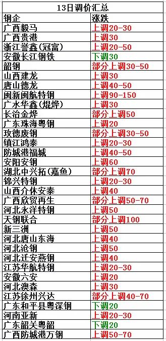 7月13日河北遷安燕鋼上調40:優質3780,優質一3770,重型一3780,重二3760,重A3740,重B3680,重C3640,中A3700,中B3620,中C3580,小型3335,統料3035,優質鑄鐵3620,普通鑄鐵3420,一級剪切料3540,二級剪切料3500,三級剪切料2950,不含稅。