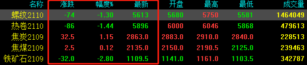 今日期貨午后走弱,持續下跌。期螺下跌74收報5613,期卷下跌86收報5896,焦炭上漲32.5收報2863,焦煤上漲2.5收報2135,鐵礦石下跌32收報1109.5。