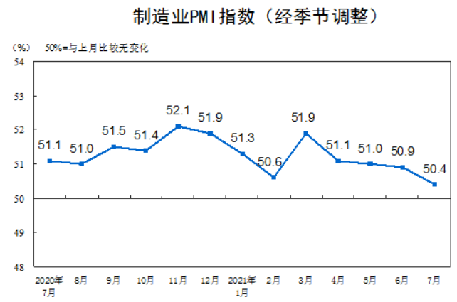 國家統計局公布最新消息顯示,7月中國制造業采購經理指數PMI為50.4%,低于上月0.5個百分點,但繼續位于50%臨界點之上,反映目前國內制造業仍保持穩步擴張態勢,但增長的步伐有所放緩。細分指標來看,生產指數51%,回落0.9個百分點,新訂單50.9%,回落0.6個百分點,說明生產延續擴張,需求仍有增長,但整體增速均有減弱。