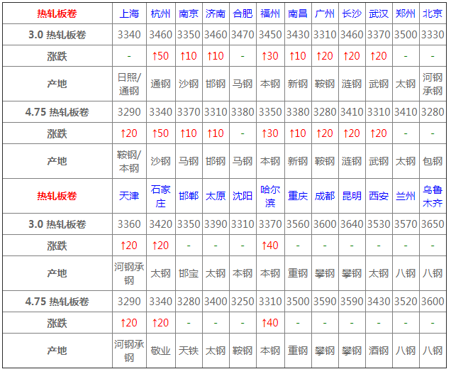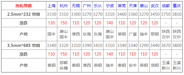 唐山熱帶續漲運行。價格方面,唐山國義145-235系2.5基價3280漲20含稅出廠,票減250;瑞豐帶鋼出廠漲10:880-850報3300,585-550報3260,335-330/360-355、325-315報3250,現款含稅。