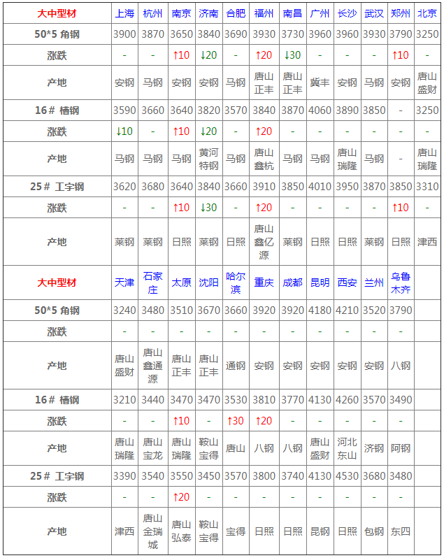 型材窄幅上揚。截至發稿時,唐山正豐5#角鋼3350穩,瑞興8-14#槽鋼3330漲20,唐城工字14-18#3310漲20。