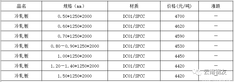 22日昆明市場(chǎng)冷軋板價(jià)格暫穩(wěn)觀望,具體如下(磅計(jì)):