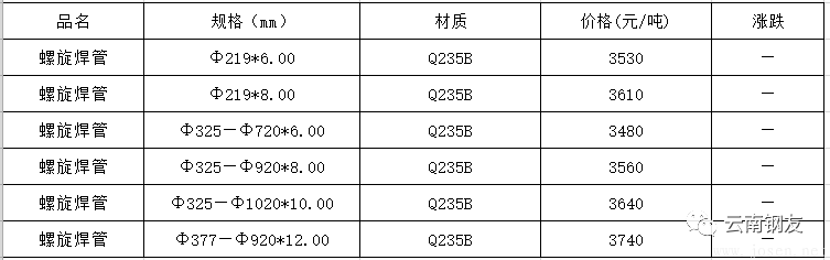 22日昆明市場(chǎng)螺旋焊管價(jià)格暫穩(wěn)觀望,具體如下(理計(jì)):