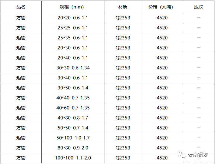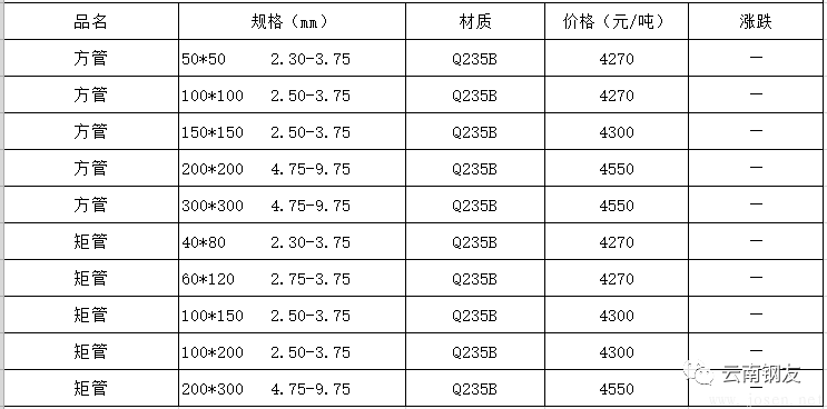 22日昆明市場(chǎng)方矩管價(jià)格暫穩(wěn)觀望,具體如下(過(guò)磅):