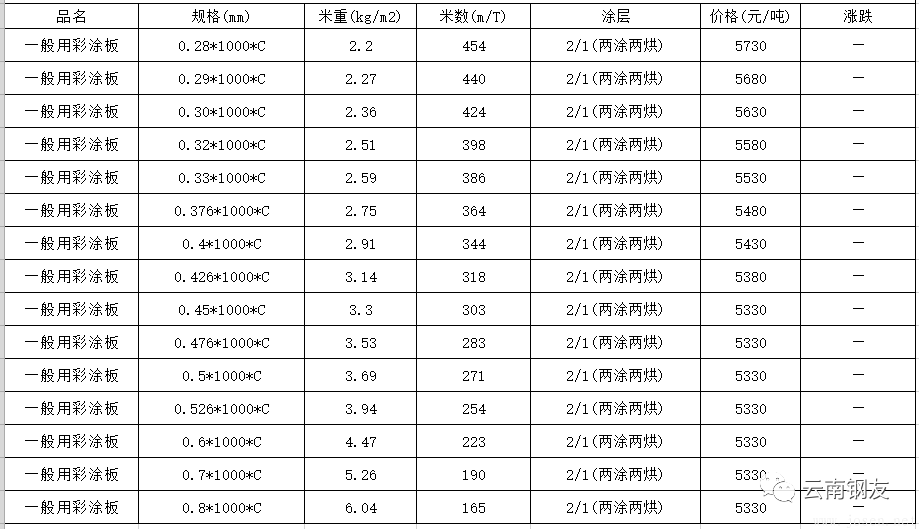 22昆明市場(chǎng)彩涂卷價(jià)暫穩(wěn)觀望,具體如下(昆明華信廠價(jià)):