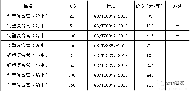 22日昆明市場(chǎng)鋼塑復(fù)合管價(jià)格暫穩(wěn)觀望,具體如下(支):
