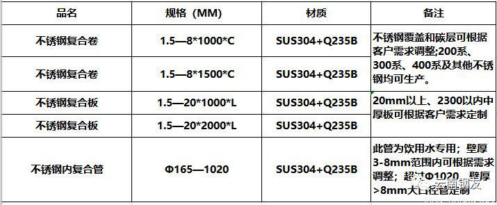 2、不銹鋼復(fù)合材料介紹:不銹鋼復(fù)合材料不僅具有不銹鋼的耐腐蝕性,表面美觀,而且具有碳鋼良好的機(jī)械性能與加工性能,廣泛應(yīng)用于食品、飲水、釀造、醫(yī)藥、消防、能源與環(huán)保、石油、化工、煤焦化、鹽化工、水利、電力、建筑、裝飾、印染、化肥、造紙等領(lǐng)域。