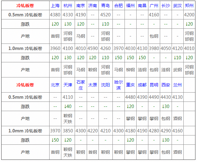今冷軋市場下跌為主,本鋼資源領(lǐng)跌,有些入庫有些靠港,壓力較大,且臨近月底,資源仍較緊張,商家不得以出庫。據(jù)了解,近期期貨盤面震蕩,市場恐慌情緒較濃,操作上多以低價出貨套現(xiàn)為主,緩解資金壓力降低風(fēng)險。低價資源刺激有一定的效果,場內(nèi)大戶一些資源有售罄情況,但多數(shù)不太理想不及預(yù)期,大戶日均出貨量僅達6-7成水平左右,中小戶甚至4-5成水平。心態(tài)方面,多數(shù)貿(mào)易商情緒悲觀,對后市不是很看好。綜合考慮,預(yù)計短期冷軋卷板價格弱勢難改。