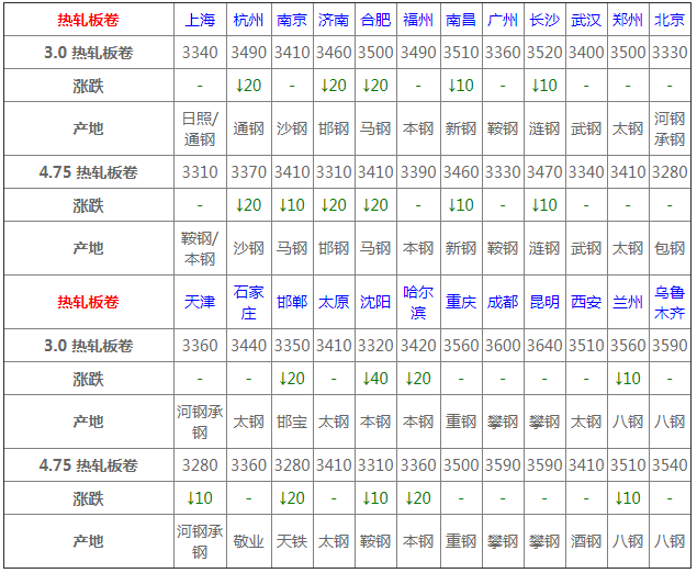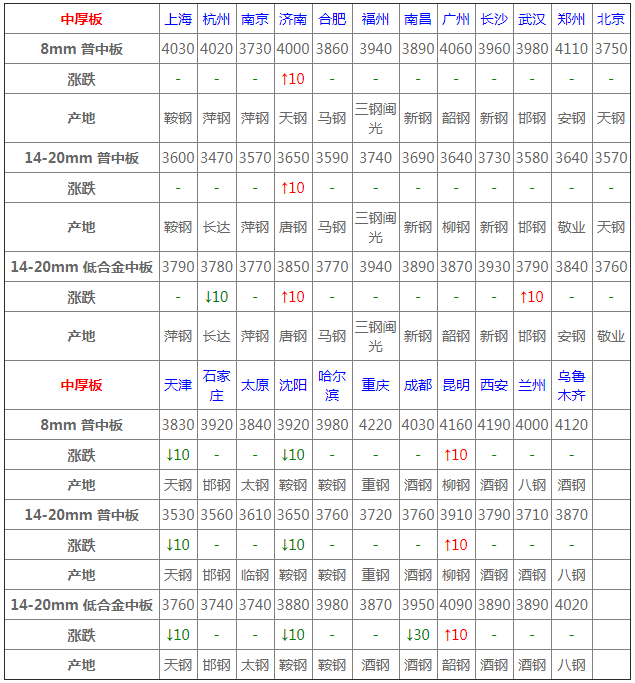 今現貨價格穩中趨弱。從市場了解的情況來看,今日受期貨下降影響,早盤現貨詢盤氛圍冷清,商家心態謹慎,下游整體情緒一般,后市來看,商家挺價意愿偏低,預計短期內中厚板市場價格窄幅弱調。