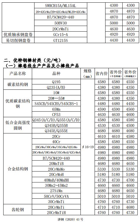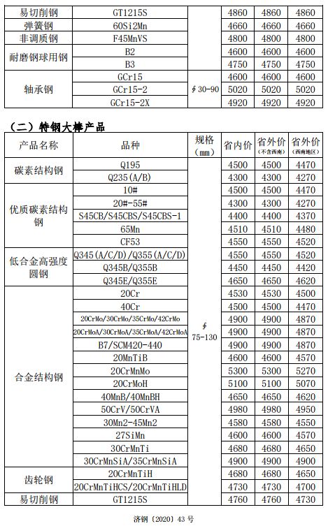 濟源鋼鐵產品現款價格表(品種鋼)