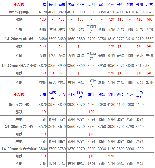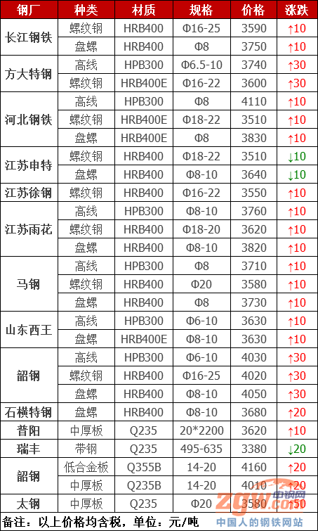 今日鋼廠出廠價格漲勢放緩,以穩為主,個別弱勢。華東地區因缺乏期螺指導,價格仍慣性上漲,但漲幅收窄。華北地區鋼坯鎖價,挺價力度有限,鋼企價格主穩,商家觀望情緒增加,成交轉弱,個別鋼企迫于出貨壓力,價格小幅走低。西部地區需求尚可,鋼廠價格回穩,預計明日鋼廠價格持穩運行。據中鋼網(微信公眾號:中鋼網)數據監測,今日統計32家鋼廠調價漲幅最高為太鋼中厚板,調價幅度50元/噸,跌幅最大為瑞豐帶鋼,調價幅度20元/噸,具體調價明細如下: