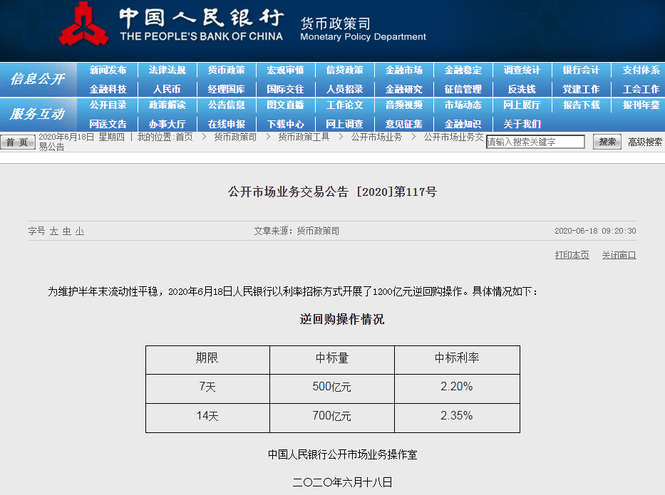 央行重啟14天逆回購“降息”20個基點