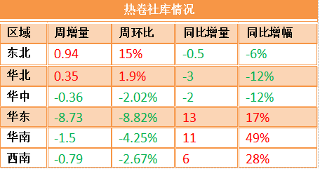 相較于建材,熱卷降庫幅度更為明顯,尤其是華東、華南地區去庫加快,總庫存較去年同期漲幅收窄至50%以內。目前板強長弱在華東、華南地區表現明顯。