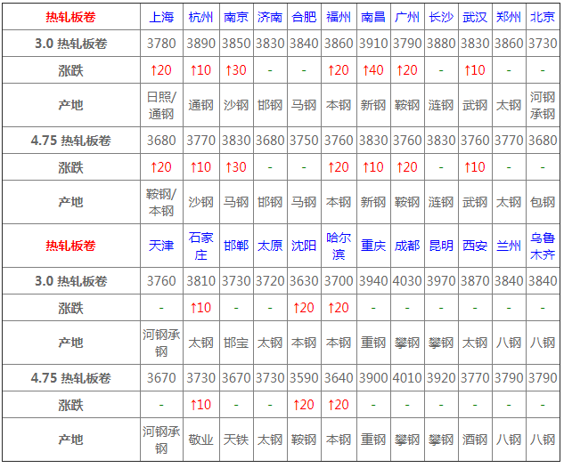 熱卷24個市場中10個市場上漲10-30,4.75熱軋板卷平均價格3763元/噸,,較上個交易日上調7元/噸;