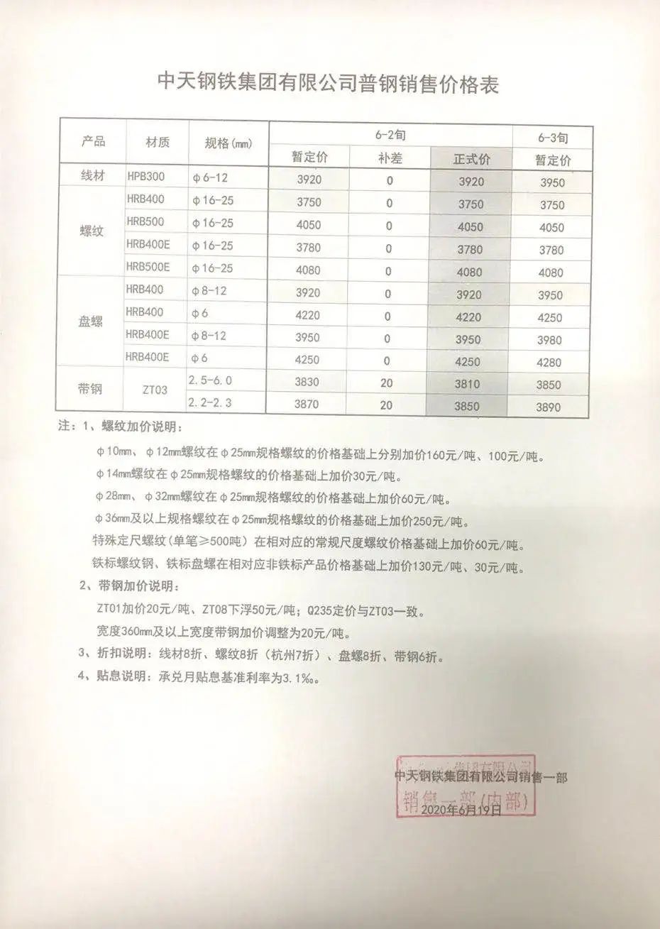 2、盤螺上調20元/噸,現Φ8-10mm HRB400執行價格為3860元/噸,Φ6mm HRB400執行價格為4160元/噸,Φ12mm HRB400執行價格為3860元/噸,抗震盤螺在普通盤螺基礎上加價30元/噸;  以上調整均為含稅價格,執行日期從2020年6月20日起。