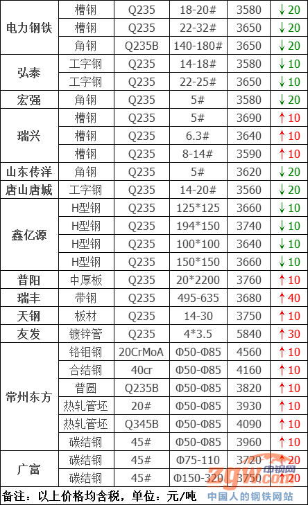 統計的35家鋼廠調價中,漲幅最高為瑞豐帶鋼,調價幅度40元/噸,跌幅最大為山東傳洋型材,調價幅度20元/噸,具體調價明細如下: