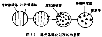 T-絕對溫度,A-物性參數,b-常數,e-自然對數底 溫度升高,完全球化所需的時間便明顯減少。 碳擴散速度與合金元素對碳在固溶體中擴散的影響有關。因而,凡是能形成穩定碳化物的合金元素,或進入固溶體中可降低其原子擴散系數的合金元素,均能阻止或減緩球化及其積聚過程。單純碳鋼最易球化,鈦 、鈮、鉬、鉻、釩可提高球光體穩定性。 此外,在鋼的化學成分的溫度相同的條件下,球化速度還與鋼的晶粒度,冷加工變形度和滲碳體片大小有關。 細晶粒鋼,球化時間短,總表面積大 冷加工變形度大時間短,塑性變形中的晶格畸變,導致內能增加,擴散速度加快,球化過程首先在此發生。 過小的滲碳體片縮短了擴散距離,加速球化。 7.1.3 珠光體球化的級別 分6級