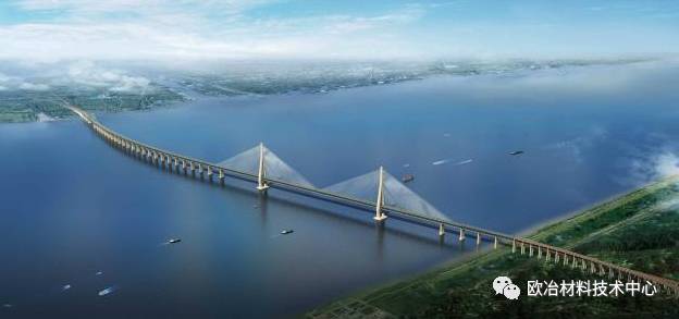 預計2019年通車,五跨連續鋼衍梁斜拉橋,6線鐵路,主跨1092米,鋼種為 Q500qE鋼,武鋼等生產。