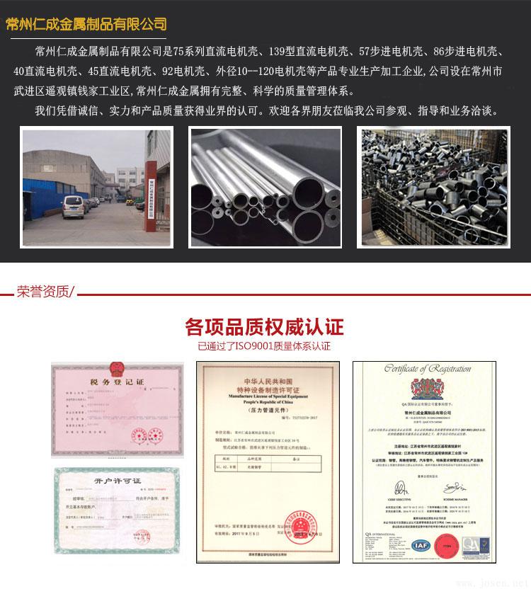 常州仁成金屬制品有限公司 主要生產(chǎn)銷售:電機(jī)殼鋼管 無(wú)縫鋼管, 高精密無(wú)縫鋼管, 精密機(jī)械用無(wú)縫鋼管, 流體輸送用無(wú)縫鋼管, 普通結(jié)構(gòu)用無(wú)縫鋼管, 精密光亮無(wú)縫鋼管, 光亮退火精密鋼管, 光亮正火鋼管, 回火鋼管, 調(diào)質(zhì)鋼管, 冷軋精密鋼管,冷拔精密鋼管, 冷軋精密鋼管, 以及鋼管的衍生產(chǎn)品, 鋼管鋼鐵制品, 只要您有圖紙, 我們就可以幫你做到.相信沒(méi)有最好,只有更好. 在精密無(wú)縫鋼管精軋焊接鋼管的基礎(chǔ)上常州仁成金屬制品有限公司對(duì)鋼管進(jìn)行深度精密機(jī)械加工,生產(chǎn):75系列直流電機(jī)殼、139型直流電機(jī)殼、57步進(jìn)電機(jī)殼、86步進(jìn)電機(jī)殼、40直流電機(jī)殼、45直流電機(jī)殼、92電機(jī)殼、外徑10--120電機(jī)殼等產(chǎn)品專業(yè)生產(chǎn)加工企業(yè),公司設(shè)在常州市武進(jìn)區(qū)遙觀鎮(zhèn)錢家工業(yè)區(qū),常州仁成金屬擁有完整、科學(xué)的質(zhì)量管理體系。