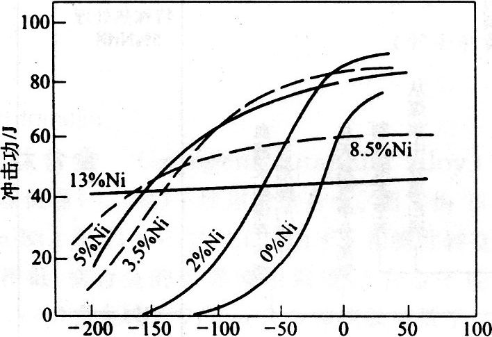 (3)鎳系低溫鋼。這類鋼是以鎳為主要合金元素的低溫用鋼。鎳是提高鋼的低溫韌性最有效的元素,隨著鋼中鎳含量的增加低溫韌性提高,最低使用溫度降低,它主要用于制造在-40~-196℃下使用的低溫設備。根據使用溫度的不同確定了不同的鎳含量。如,正火的2.5%鎳鋼可用到-50℃,正火或正火+回火處理的3.5%鎳鋼可用到-88℃,調質的3.5%鎳鋼可用到-104℃,調質的5%鎳鋼可用到-162℃,9%鎳鋼可用到-196℃,含鎳的低溫鋼已形成完整的系列。
