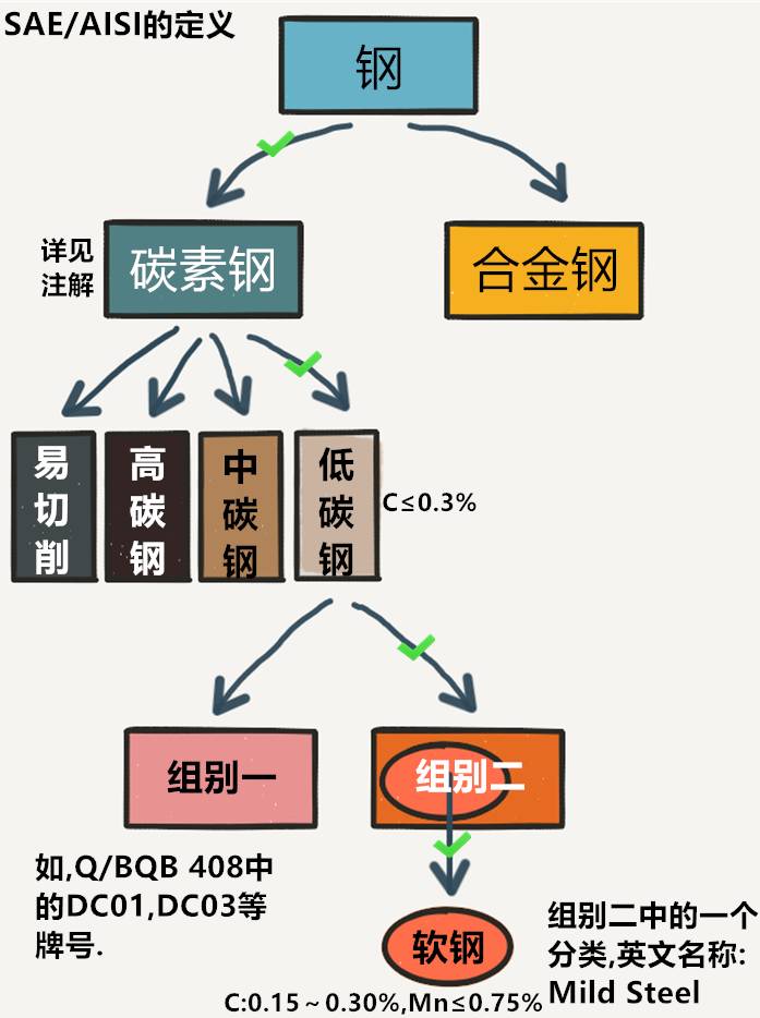 軟鋼(Mild Steel)歸屬于第二組別中的一個分類,也即指含碳量0.15%~0.30%,Mn含量不大于0.75%的這一個分類