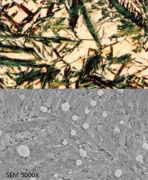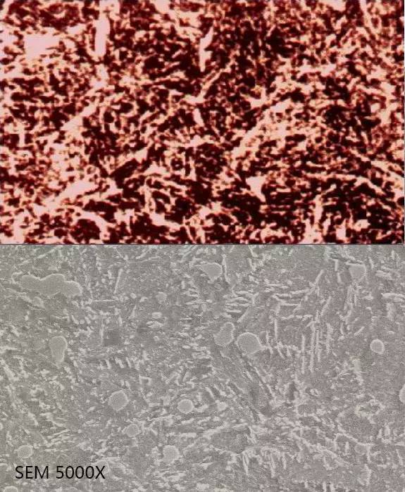 這種組織極易受腐蝕,光學(xué)顯微鏡下呈暗黑色針狀組織(保持淬火馬氏體位向),與下貝氏體很相似,只有在高倍電子顯微鏡下才能看到極細(xì)小的碳化物質(zhì)點(diǎn)。