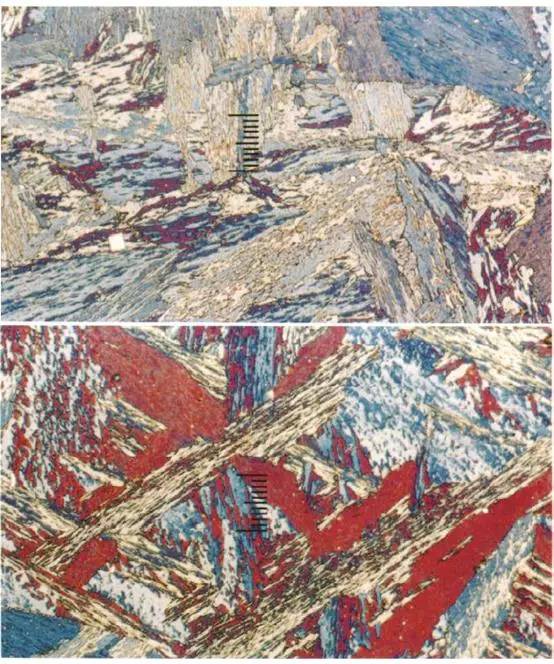 特征:晶粒粗大,形態(tài)有片狀、羽毛狀或三角形